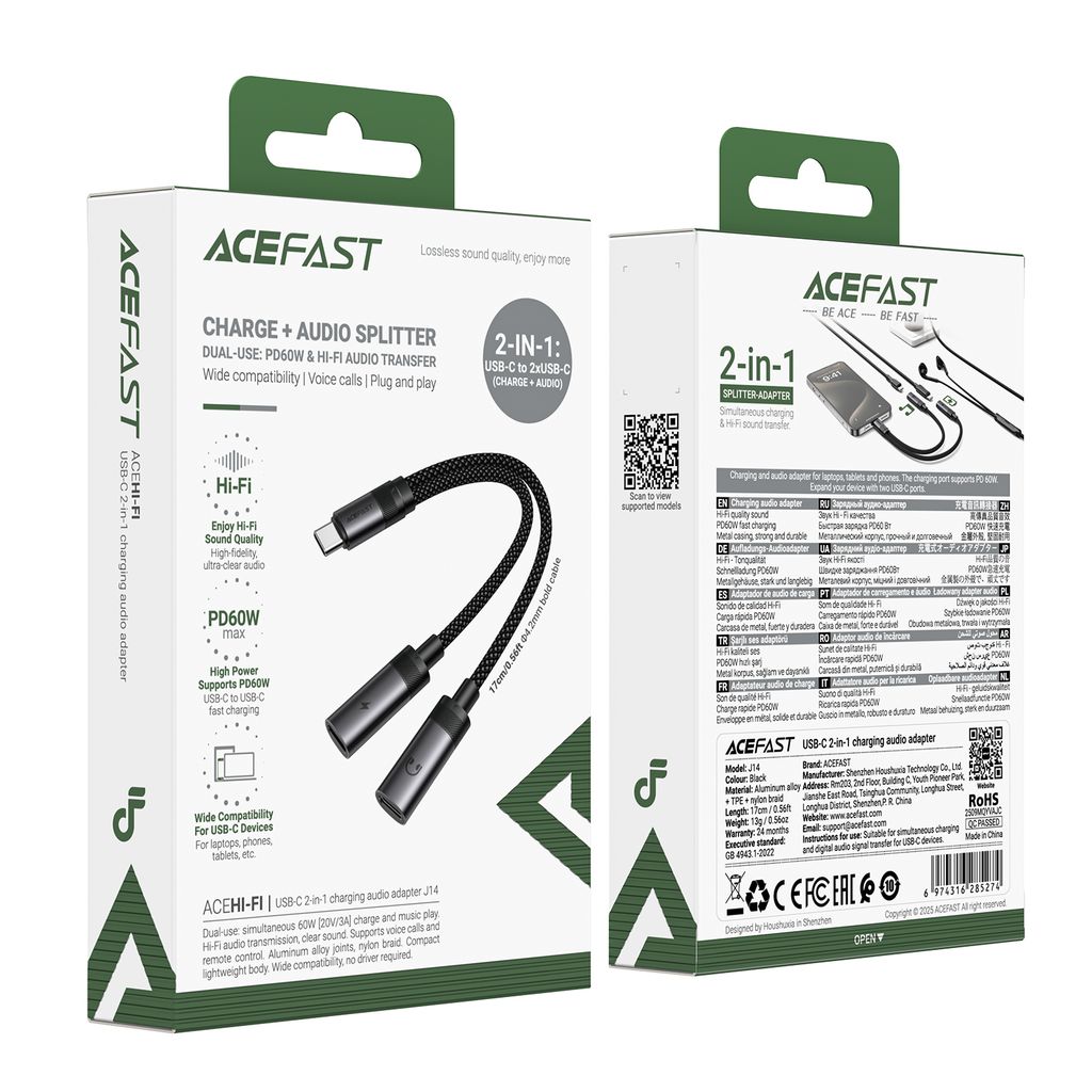 • Cáp chuyển đổi ACEFAST J14 2 trong 1 cho phép vừa sạc thiết bị vừa nghe nhạc cùng lúc, mang lại trải nghiệm liền mạch không bị gián đoạn