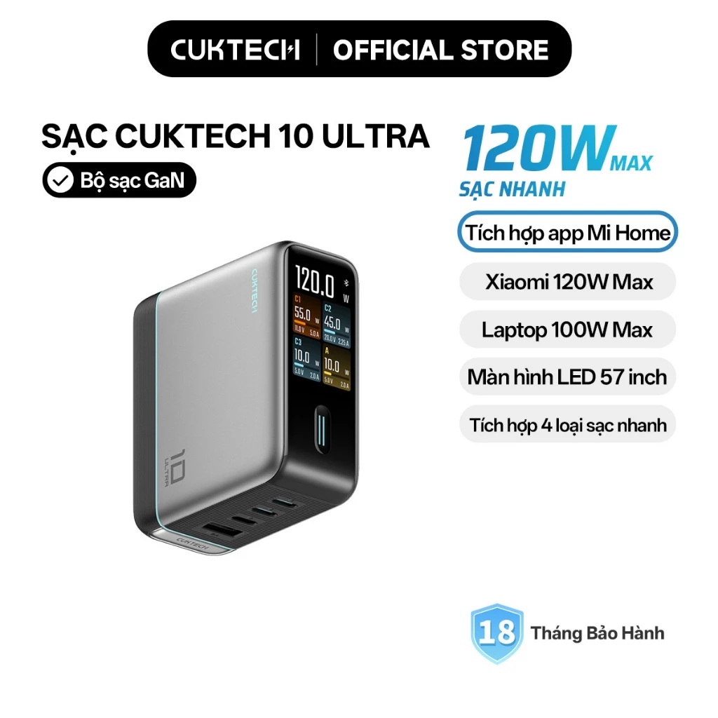 Củ sạc nhanh GaN CUKTECH AD1204U 120W là giải pháp sạc đa năng cao cấp, được thiết kế dành cho người dùng hiện đại cần một thiết bị vừa mạnh mẽ, vừa tiện lợi. Sản phẩm ứng dụng công nghệ GaN tiên tiến, mang lại khả năng sạc nhanh vượt trội, hiệu suất ổn định và tiết kiệm năng lượng. Với 4 cổng sạc (3 cổng Type-C và 1 cổng USB-A), củ sạc này đáp ứng nhu cầu sạc cùng lúc nhiều thiết bị, từ điện thoại, máy tính bảng cho đến laptop. Đặc biệt, màn hình LED thông minh 1.57 inch cho phép người dùng theo dõi trực quan tình trạng sạc, tạo nên sự khác biệt so với các củ sạc thông thường.