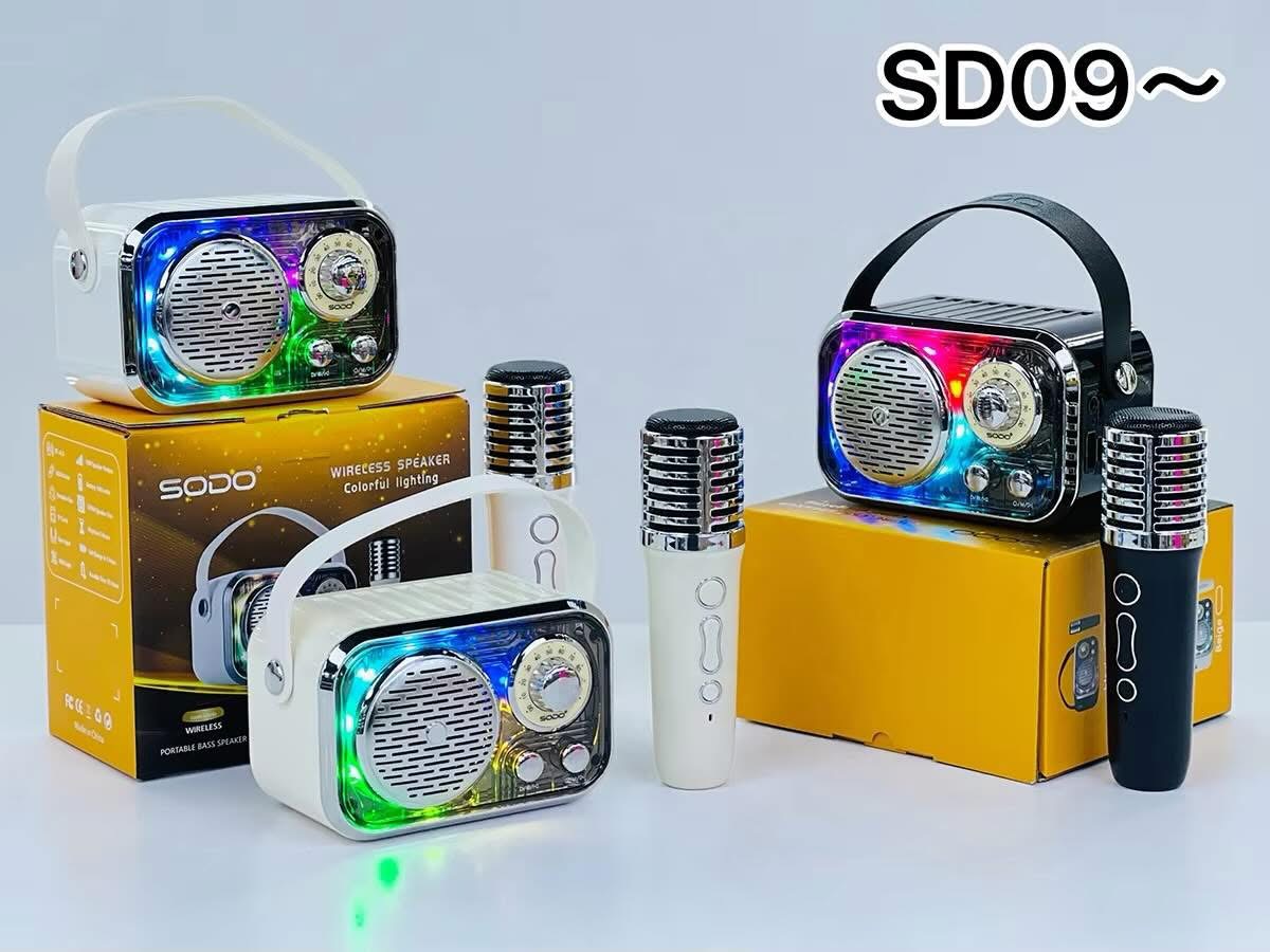 Loa trong hình là SODO SD09 – một mẫu loa Bluetooth kèm micro không dây có thiết kế kiểu retro, nổi bật với đèn LED đổi màu.