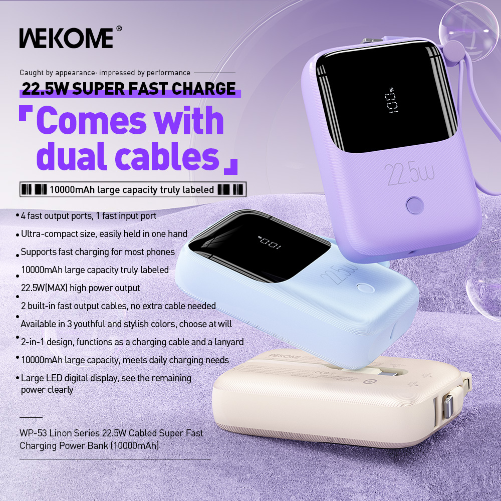 WEKOME WP-53 thuộc Linon Series, sở hữu thiết kế trẻ trung, siêu nhỏ gọn nhưng lại tích hợp 2 dây sạc nhanh ngay trên thân máy – không cần mang theo dây rời. Công suất 22.5W Super Fast Charge giúp sạc nhanh cho hầu hết smartphone hiện nay.